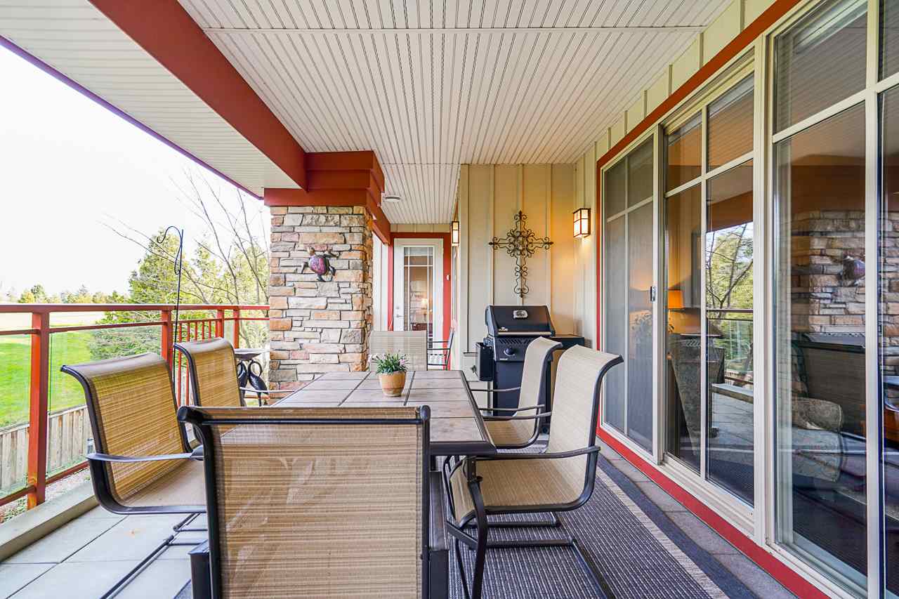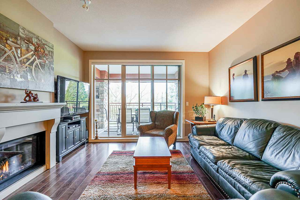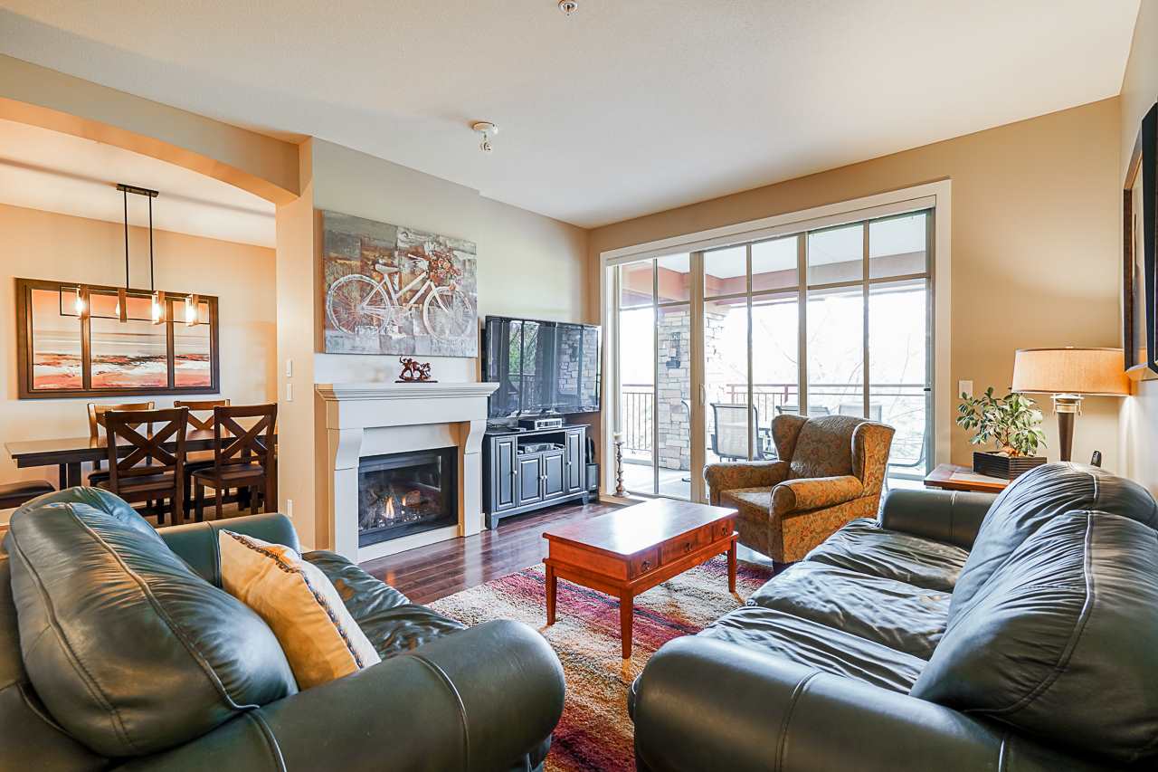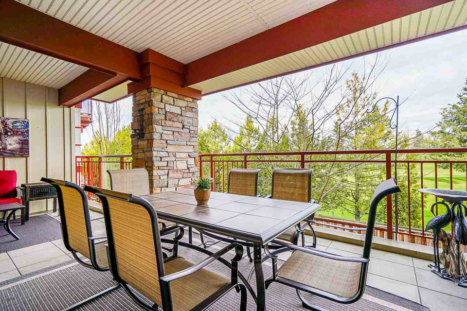 Luxurious resort living with ONE OF THE BEST GOLF COURSE VIEWS. Beautiful 2 bedroom plus den condo. Bright open plan featuring hardwood floors & quality finishing . Large island island, high quality stainless appliances inc natural gas stove. Large master bedroom opens onto balcony, huge walk in closet and 5 piece ensuite. Large second bedroom & den perfect for home office. Living room with gas fireplace opens up to your massive 350 square foot covered deck overlooking golf course. Very well run building with healthy contingency, maintenance fee includes radiant in floor heat & hot water. Many walking trails, parks and shops. Amenities galore! Fitness center, pool, jacuzzi, sauna, theatre room. Complete with 2 parking & storage room just outside your front door. View the Video, pictures.