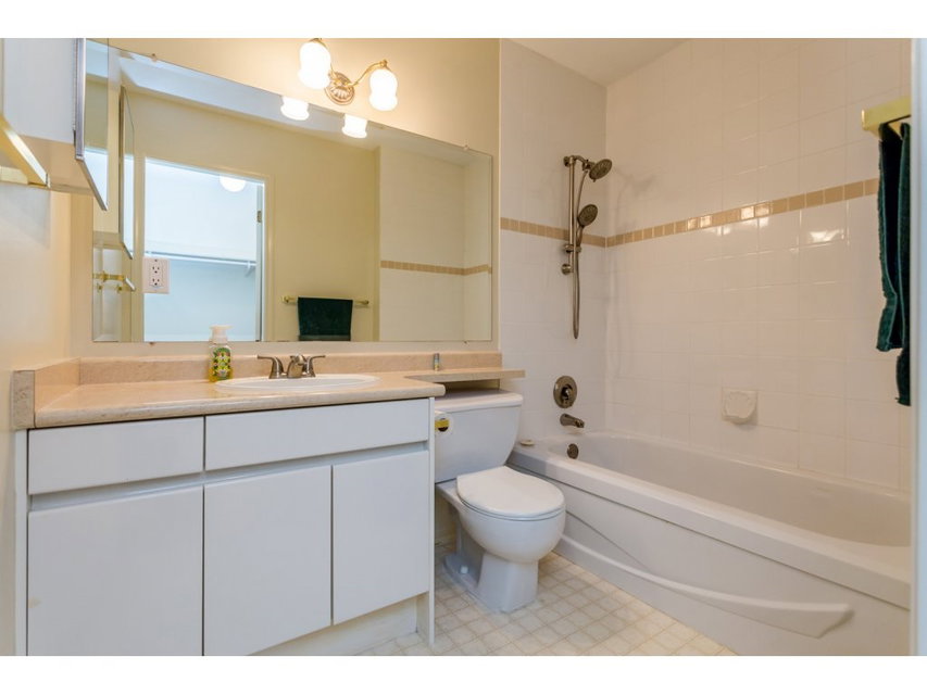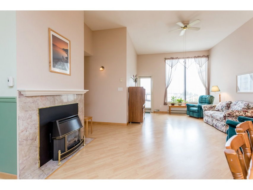 Georgian Place! Large Top Floor 1263 sq ft 2 bdrm, 2 bath. Enjoy the open feel with 11 foot ceilings in living room. South exposed floor to ceiling windows with peek of the Ocean and Islands. Open the door to your balcony and let the sea breeze in. Extra large rooms that will fit house sized furniture. Storage room includes laundry sink & room for your freezer. Skylight in foyer and natural gas fireplace make this home a winner. Leave your car at home. This is a walking community with all the shopping and amenities you need & no hills. Very well managed building with newer roof and rain screening! Quick Possession possible. View the virtual tour and floor plans and call today.